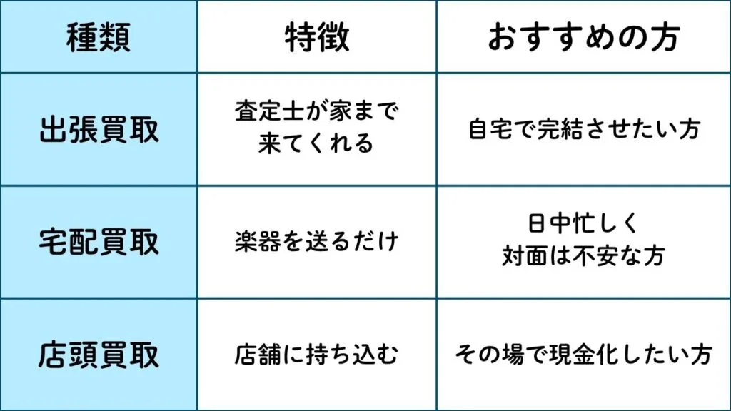 楽器の買取方法は店頭買取、出張買取、宅配買取の3つがあります。