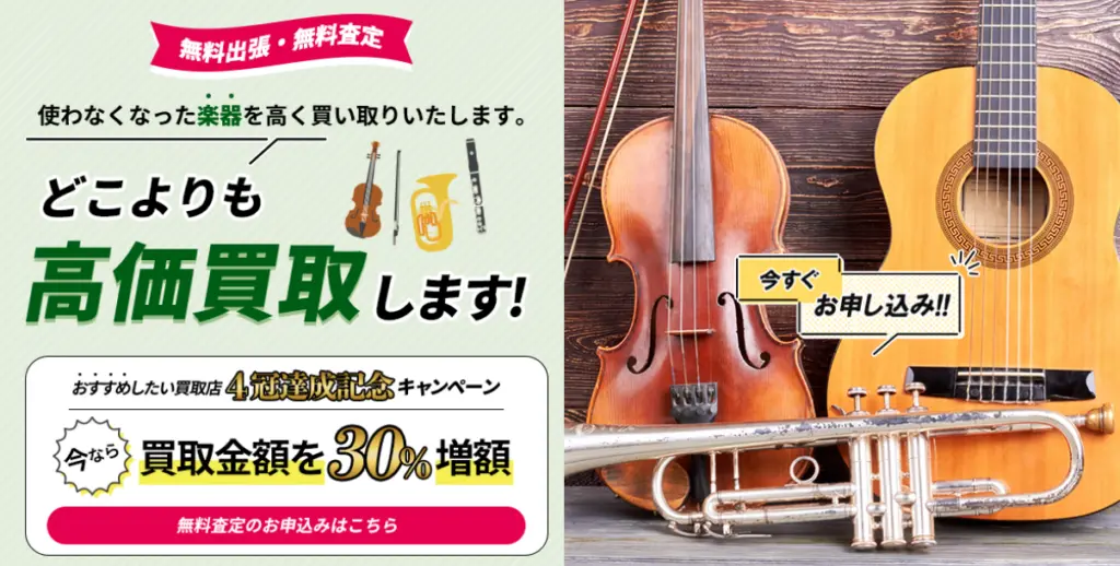 福ちゃんでは1月末まで、買取金額UPキャンペーンを開催しています。全アイテムに最大買取価格10万UPのキャンペーンが適用できるのでおトクに楽器を売ることができるでしょう。