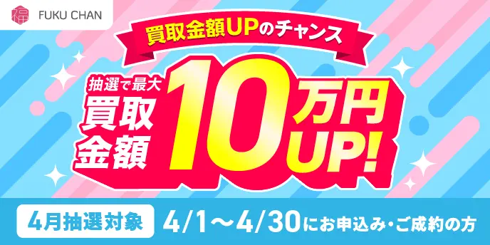 現在福ちゃんは、4月中にお申し込み頂いた商品対象で買取金額最大10万円UPキャンペーンを実施しています