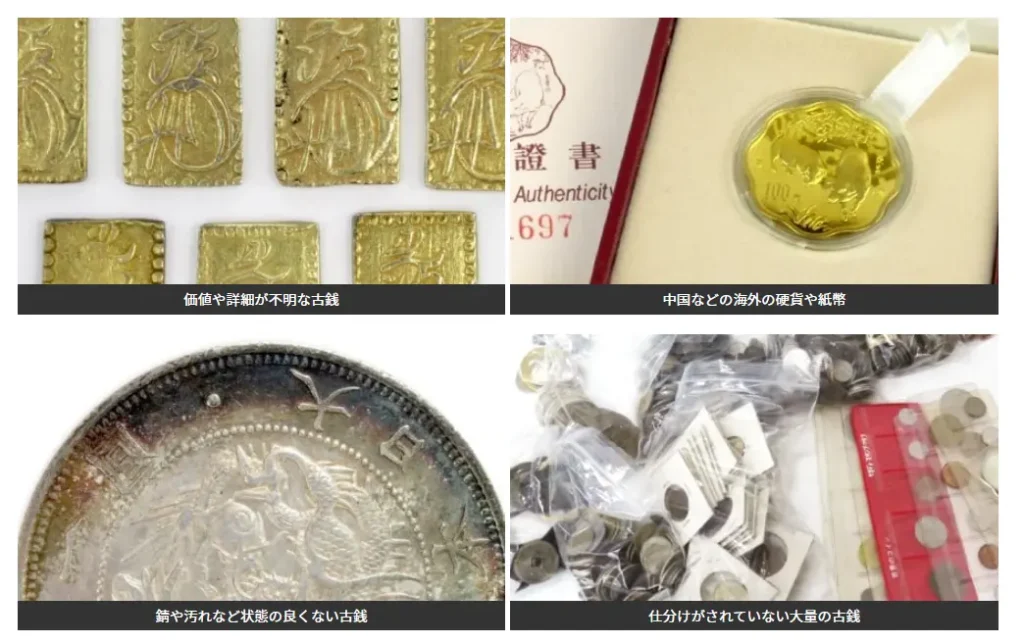 | 買取品目 | 古硬貨、古紙幣、外国古銭、記念硬貨・メダル、古金銀、エラー貨幣 |