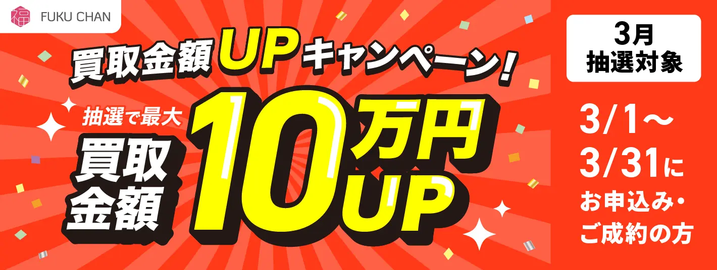 現在福ちゃんは、3月中にお申し込み頂いた商品対象で買取金額最大10万円UPキャンペーンを実施しています