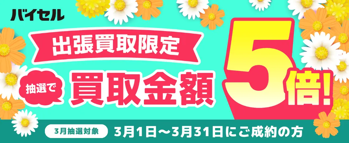 バイセルは3月末日まで、抽選で買取金額が過去最大の5倍になるキャンペーンを実施中です。 当サイトからの申し込みで参加できるので、ぜひご活用ください。